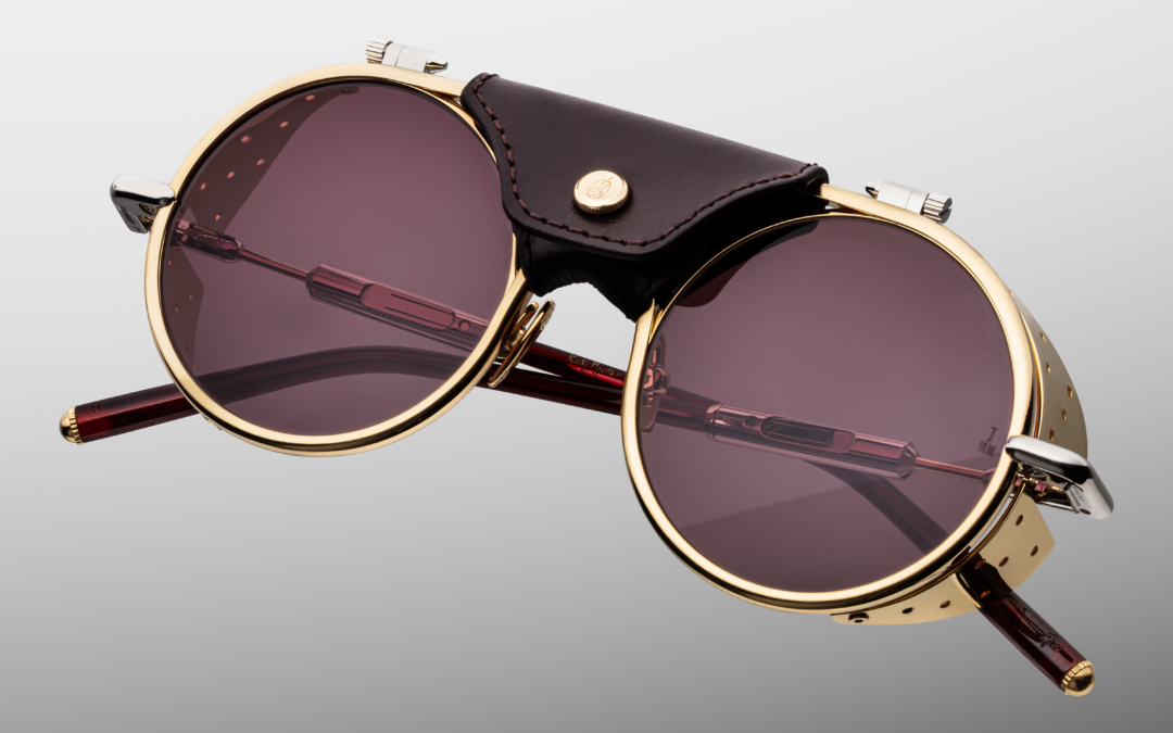 This is the frame that ties most directly to mountaineering. The circular lenses, the side shields, and the leather bridge detail all point back to older alpine eyewear, but the finish is much cleaner than a straight reproduction.
